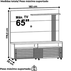 Estante Home Frizz,  desenvolvida para aliar praticidade e acabamento com destaque frisado. Estrutura em MDP 15/25/40mm (base 15mm, prateleiras/frisos 25mm e tampo 40mm), com capacidade para TVs de até 65 polegadas (suporta até 90 kg distribuídos). Possui 02 nichos abertos, 01 prateleira superior com luminária LED embutida, além de frisos decorativos nas laterais. Conta também com 02 passa-fios, puxadores cromados (em metal) e 06 rodízios sem freio, (sendo 5 em silicone e 1 em plástico). Acabamento em pintura UV texturizada (fosca e brilho). Este móvel chegará separado em 02 volumes.