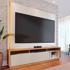 Estante Home Jordão, combina design contemporâneo e funcionalidade para transformar sua sala. Estrutura em MDF/ MDP (25, 15 e 12 mm), conta com acabamento em pintura UV texturizada. Possui 2 portas de correr com detalhes ripados, lateral do painel usinada com LED embutido, passa fios e pés inclusos (montagem opcional). Suporta TVs de até 75 polegadas com segurança. Este produto será entregue em 3 volumes.