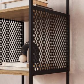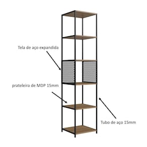 CARACTERÍSTICAS TÉCNICAS: - Estrutura em metal resistente - Cor: Preto e Marrom - Prateleiras em MDP de 15mm - 5 nichos espaçosos - Nicho superior telado para um design diferenciado - Suporta até 40kg