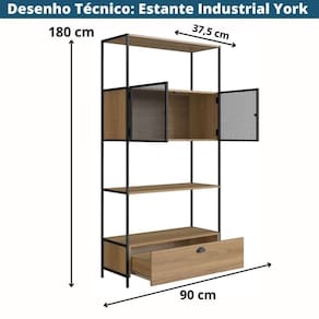 A Estante Industrial York da Artesano é moderna, urbana e autêntica, móvel produzido em MDP 15mm com acabamento em BP, as portas são em aço com detalhes de chapa expandida, acabamento em pintura epóxi fosca e fecho magnético, a gaveta tem puxador metálico e corrediça telescópica com extração total. Estante é um móvel versátil e importante para a decoração e organização de diversos ambientes, a linha York é moderna e tem uma pegada industrial, torna-se a opção ideal para quem gosta de personalidade e praticidade na hora de decorar.