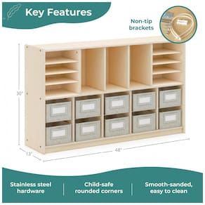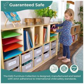 Marca: Guidecraft Fabricante: Guidecraft Linha / Coleção: EdQ Modelo: EdQ Shelves and 10 Bin Storage Unit 30" - Natural (G80319) Tipo de produto: Estante infantil baixa com prateleiras e nichos com caixas de tecido Cor: Natural Acabamento: Pintado / natural Material da estrutura: Compensado de bétula Tipo de prateleira: Cubby shelf (prateleiras com nichos) Quantidade de prateleiras: 5 Quantidade de nichos inferiores: 10 Tipo de montagem: Piso (floor mount), freestanding Formato: Retangular Fundo: Fechado Ambiente indicado: Sala de aula, homeschool, quarto infantil e espaços de brincar Faixa etária recomendada: Infantil (a partir de 3 anos) Dimensões totais (L x P x A): 121,9cm x 33cm x 76,2cm Número de caixas de tecido: 10 unidades Peso do produto: 34,2kg Peso do pacote (produto + embalagem): 36kg Cuidados de limpeza: Limpar com pano seco Instalação: Produto de piso, não requer fixação em parede Necessita montagem: Sim (ferragens e instruções incluídas) Conteúdo da embalagem: 1 estante, 10 caixas de tecido, ferragens e manual de montagem Manual do usuário: Inglês Marca: Não Informado
