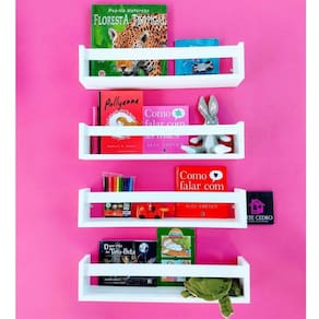 - kit com 5 prateleiras para livros, brinquedos, itens de cozinha, banheiro etc. brancas - pode ser instalado em várias posições de acordo com sua necessidade. - produto versátil, perfeito para organização e decoração de todos os ambientes. - suporta até 8 kg cada. - fácil instalação, bastando fixar na parede. - kit de instalação acompanha o produto. - medidas