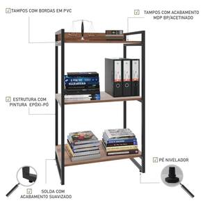Sobre o ProdutoEstante Kuadra 60X40X104cm C/03 Prateleiras Amadeirado / Est.PretaDescrição do Produto:A Estante Kuadra KUES63 tem montagem simples e versátil, podendo ser utilizada em diversas composições com outros móveis em diversos ambientes, como quarto e escritório, na sala, cozinha ou seu depó Linha Kuadra tem seu design com inspiração no estilo industrial, que remete muito a decoração usada nos Lofts das grandes metrópoles nos anos 60 e 70. Harmonizando o metal e os tons de madeira, foram projetados móveis versáteis e com estilo, que podem compor ambientes íveis cheios de personalidade, perfeitos para você decorar sua casa ou seu trabalho, tendo um resultado que caminha do estilo rústico ao Inclusos:1 EstanteDimensões dos Produtos:Estante Kuadra 60X40X104cm C/03 Prateleiras Amadeirado / 60 x 40 x 104 cmInformações Logísticas (Comp. X Prof. X Alt.) 103 x 41 x 11 cm - Peso: 12,01 KgPeso Total: 12,01 KgObservações:Não acompanha acessórios decorativos. Imagens meramente ilustrativas.Informações Técnicas / Características:- Cor do Produto: Amadeirado / - Marca: Compace- Modelo: KUES63- Linha: Kuadra- Material: Mdp- Material da Estrutura / Pés: Aço- Acabamento: BP Acetinado- Escala de Brilho: Fosco- Fita de Borda: Pvc- Possui Portas: Não - Possui Prateleiras: 3- Peso Máximo por Prateleira: 10 kg- Possui Pés: 2- Pés Niveladores: Sim - Acabamento Estrutura: Epóxi-Pó Texturizado - Suporta Até (kg): 30 kg- Comprimento: 60cm- Profundidade: 40cm- Altura: 104cm - Peso Lí.: 11,32Kg- Recomendações de Uso, Manutenção e Limpeza: Para a limpeza, utilize flanela seca ou pano macio levemente umedecido em água. Utilize um pano seco em seguida. Evite com produtos químicos (solventes, thinner, acetona, etc) e não utilize nenhum tipo de esponja de aço.- Necessita de Montagem: Sim / Acompanha Manual de Montagem- Complexidade da Montagem: Média: pode ser montado por mais de uma pessoa e/ou necessite de maior conhecimento para montagem.- Garantia: 6 meses Acabamento: BP Acetinado | Escala de Brilho: Fosco | Fita de Borda: Pvc | Material da Estrutura: Aço | Depth Front to Back: 40 cm | Acabamento da Estrutura: Epóxi-Pó Texturizado | Depth Height Floor to Top: 104 cm | Depth Width Side to Side: 60 cm | Quantidade de caixas de embalagem: 1 | Modelo: Estante Kuadra | Marca: Compace | Produto: Estante | Cômodo indicado: Escritórios | Cor: Multicolorido | Tonalidade: Multicolorido | Material: MDP | do modelo: KUES63 | Baterias são necessárias?: false | Palavras-chave de Pesquisa: Não Aplicável | da peça: KUES63 | de caixas: 1 | Componentes incluídos: Manual de montagem e kit acessórios | Fabricante: Compace | Quantidade de itens: 1 | Principais Características do Produto 0: Escritório | Certificação de teste externa: Não aplicável | Principais Características do Produto 1: BP Acetinado | Principais Características do Produto 2: Estrutura de aço | Exige montagem: true | Acabamento do móvel: BP Acetinado | Peso do item: ;unit=kilograms | Dimensões do item P x L x A: width#value=60;depth#unit=centimeters;height#value=104;height#unit=centimeters;depth#value=40;width#unit=centimeters | Recursos da Mesa: | Duração da Garantia: | Coleção de Antiguidade: | Tipo de Garantia: | Recursos da Escrivaninha: | Tipo de Mesa: | Desing da Escrivaninha: | País de Origem: | Móvel Dobrável: | Dimensões do Produto (A x L x C), sem a caixa de embalagem: | Montagem: | Base da Mesa: | Produto personalizado: | Motivo de Isenção Anvisa: | Data de validade Anvisa: | Tamanho Do Pacote: | Shape: | Formato da Escrivaninha: | Nr. do Lote do Produto: | Comprimento: | Altura da Mesa: | Código Anvisa do Produto: | Formato do Espelho: | de Assentos: | Qtd. de Produto no Lote: | Funcionalidades: | Temas de Estampas: | Estilo: | Quantidade: Cor: Nogal /