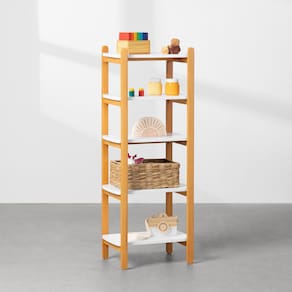 A Estante Mary Branco com Amêndoa - 112cm possui 5 prateleiras que vão ajudar na organização do quartinho do seu pequeno. Com o design minimalista, vai se encaixar perfeitamente no seu espaço, podendo ser usada para guardar livros, brinquedos, objetos decorativos e diversas composições criativas.