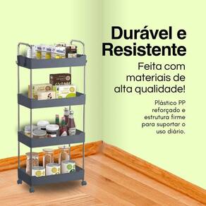 Prateleira Multiuso 4 Andarem com Rodinha Cinza Com as prateleiras Multiuso da Globalmix seus espaços ficarão muito mais organizados. Bonitas, úteis, duráveis, e fácil de montar, elas facilitam sua vida, proporcionando mais organização e beleza aos seus espaços. Podem ser usadas na cozinha, banheiro, lavanderia, escritórios e onde sua imaginação alcançar. Desenvolvidas com Plástico PP Cinza de alta resistência e hastes de sustentação em aço inox, além de rodízios que giram 360para maior mobilidade e praticidade ?Cor: Cinza com hastes e alças em inox e rodas CinzaAltura: 89 cmLargura: 22 cmComprimento: 40 cm