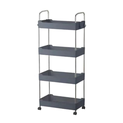 - Cor: Cinza com detalhes em inox e rodas na mesma tonalidade.Estante MÃvel Compacta 4 Andares em PlÃstico Cinza com Rodas GiratÃrias