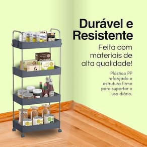 Prateleira Multiuso 4 Andarem com Rodinha Cinza Com as prateleiras Multiuso da Globalmix seus espaços ficarão muito mais organizados. Bonitas, úteis, duráveis, e fácil de montar, elas facilitam sua vida, proporcionando mais organização e beleza aos seus espaços. Podem ser usadas na cozinha, banheiro, lavanderia, escritórios e onde sua imaginação alcançar. Desenvolvidas com Plástico PP Cinza de alta resistência e hastes de sustentação em aço inox, além de rodízios que giram 360para maior mobilidade e praticidade ?Cor: Cinza com hastes e alças em inox e rodas CinzaAltura: 89 cmLargura: 22 cmComprimento: 40 cm