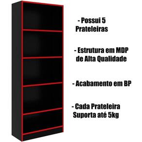 Estante Multiuso Gamer Livreiro Office 5 Prateleiras Preto/vermelho A Estante Multiuso Gamer Livreiro Office foi projetada para oferecer praticidade e um visual moderno que combina perfeitamente com ambientes gamer, office ou residenciais. Seu design é versátil, permitindo organizar livros, objetos de decoração, periféricos e acessórios, deixando o espaço muito mais organizado e estiloso. Dimensões da Estante Multiuso Gamer Livreiro Office 5 Prateleiras: - Altura: 160 cm - Largura: 59,8 cm - Profundidade: 25,5 cm