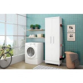 Possui 5 prateleiras que pode ser montado de diversas formas, 2 portas, com suporte esterno para penturar vassouras, rodos ou o que você preferir,