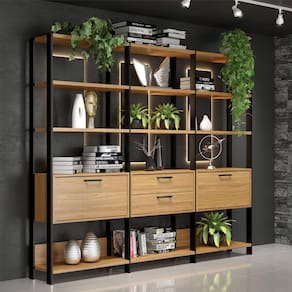A estante é feita inteiramente em MDF e possui três torres, duas portas basculantes e duas gavetas. Este móvel oferece uma solução versátil para armazenamento e organização em sua casa ou escritório. As três torres proporcionam espaço amplo para exibir objetos decorativos, livros, documentos e outros itens. As duas portas basculantes podem ser usadas para ocultar itens que você deseja manter fora da vista, enquanto as duas gavetas oferecem espaço adicional para armazenamento discreto.