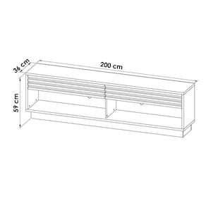 Dimensões(Cm): Comnto(Profundidade): 36cm x Largura: 200cm x Altura: 59cm Material de Estrutura - Estrutura 100% MDP Tipo de Pintura - UV Tipo de Acabamento da Pintura - Pintura Semi Brilho Tipo de Corrediça - Corrediças Telescópicas Quantidade de Gavetas - 2 Gavetas Ideal para TVs até (Polegadas) - 65 Montagem do Produto - Desmontável Certificação de Qualidade - Qualidade Aprovada Garantia - 3 meses