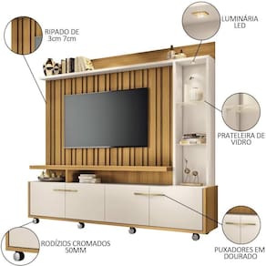 O Home Para Sala possui um visual marcante com o autêntico ripado montado em larguras intercaladas, que dá um toque de sofisticação e modernidade ao ambiente. Além disso, ele conta com quatro portas com dobradiças laterais e puxadores metálicos em tom dourado, que oferecem espaço para guardar objetos e acessórios. O nicho lateral com prateleiras de vidro 6mm é ideal para expor itens decorativos, livros ou eletrônicos. A luminária LED embutida ilumina o painel e cria um clima aconchegante e elegante. O Painel Para também possui rodízios cromados de 50mm, que facilitam a movimentação e a limpeza do móvel. O produto é produzido em MDP e MDF, garantindo resistência e durabilidade. O acabamento é feito com pintura UV, que protege o móvel contra riscos e desgastes.