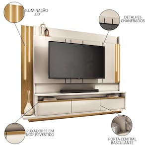 Ela possui um design moderno e imponente, com espaço para acomodar uma TV de até 75 polegadas. A Estante Para Sala conta com duas gavetas com corrediças telescópicas, que facilitam a abertura e o fechamento, e uma porta central basculante com pistão a gás, que garante maior segurança e durabilidade. Os puxadores são em MDF revestidos, combinando com o acabamento do home. Um dos destaques deste produto é a iluminação LED, que cria um efeito cascata, elegante e aconchegante no ambiente. O Painel Para TV tem detalhes chanfrados, que dão um toque de charme e requinte ao móvel. O Home Para Sala é produzido em MDP e MDF, com diferentes espessuras, e o acabamento em pintura UV garantindo resistência e qualidade ao produto.