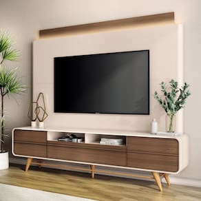 Crie uma experiência cinematográfica em casa com a Estante Painel de TV 85 Pol 220cm Nobre Castanho/Off White, da HB Móveis.