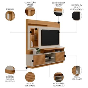 Os compartimentos como prateleiras, nichos e portas oferecem espaço para dispor os mais diversos itens decorativos e eletrônicos, de modo que você consiga dar um toque de personalidade, que expresse a sua família. Além disso, essa estante para sala possui detalhes clássicos que estão sempre na moda, como os espelhos e luminárias LED nos nichos, além dos ripados nas portas deslizantes. Ah, e para vocês curtirem as séries e filmes favoritos, o painel para tem capacidade de suportar aparelhos de até 60 polegadas, criando um ambiente de cinema no conforto da sua casa.