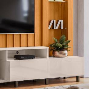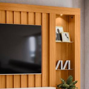 Fabricada com chapas de MDP de 15 e 25mm, o móvel combina resistência e durabilidade. Seu Painel de com detalhes sobrepostos cria um visual sofisticado, enquanto a luminária LED integrada valoriza o ambiente. O destaque fica por conta da porta deslizante ível em MDF, que oferece praticidade e um toque de exclusividade com seu design curvo. As prateleiras de vidro de 5mm garantem espaço para objetos decorativos, enquanto o nicho central é ideal para acomodar aparelhos eletrônicos. Além disso, a Estante Para Sala conta com duas gavetas equipadas com corrediças telescópicas, proporcionando organização eficiente. Os pés em poliestireno asseguram estabilidade e um acabamento refinado, complementado pelo puxador em bronze que harmoniza com o visual, o Home Theater é ideal para TVs de até 70 polegadas, otimizando seu espaço e elevando o conforto da sua sala.