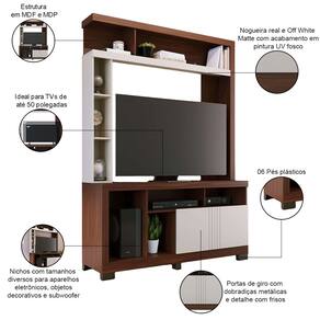 09 nichos com tamanhos diversos para aparelhos eletrônicos, objetos decorativos e subwoofer.