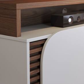 Painel lateral com frisos e bancada com aplique ripado decorativo.