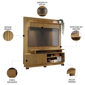 Características do Produto Material da Estrutura: MDP/MDF. Espessuras das Chapas: 15mm/25mm. Peso Suportado: 65 Kg Distribuídos. Acabamento: Pintura UV. Escala de Brilho: Fosco. Suporta TV de até: 65 Polegadas. Possui Prateleiras: Sim. Quantidade de Prateleiras: 2 Prateleiras. Possui Portas: Sim. Quantidade de Portas: 1 Porta. Tipo de Portas: Deslizante. Possui Tampo: Sim. Espessura do Tampo: 25mm. Possui Nicho: Sim. Quantidade de Nichos: 3 Nichos. Possui Gavetas: Não. Possui Puxador: Sim. Material dos Puxadores: Poliestireno. Possui Espelho: Não. Possui Pés: Sim. Material dos Pés: Poliestireno. Quantidade de Pés:6 Pés. Diferenciais: - Porta deslizante. - Borda frontal chanfrada. - Detalhes frisados. - Estrutura robusta em MDP. Sistema de Montagem: Cavilhas/Parafusos/Minifix. Manual de Montagem: Sim. Complexidade da Montagem: Alta. Volumes: 3 Volumes. Conteúdo da Embalagem: 1 Estante. Garantia do Fabricante: 90 dias contra defeito de fabricação. Montagem: Recomendamos que seja feita por um profissional. Recomendação de Limpeza: Utilize pano levemente úmido.