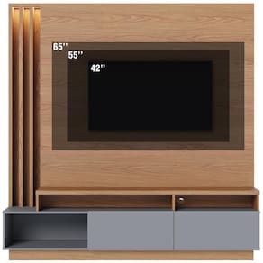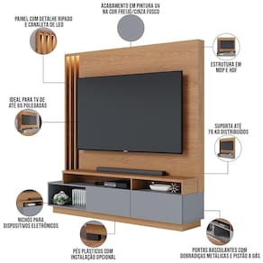 Com linhas retas e design minimalista, essa estante home comporta televisores de até 65 polegadas no painel, além dos espaços extras nos nichos para os demais aparelhos eletrônicos, enquanto o compartimento interno das portas garante a organização. Já o charme fica por conta do detalhe ripado na lateral do painel para , que recebe destaque da iluminação LED e transmite um ar acolhedor.