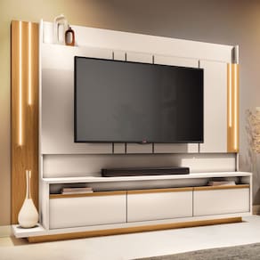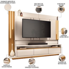 Elegante e funcional, a Estante Painel para TV 75 Pol com LED Mound B01 Off White/Cinamomo, da Lyam Decor, é uma excelente opção para quem busca um móvel para a sala de tv que, além de manter tudo no lugar, ainda dê aquele toque de harmônico e moderno ao ambiente. Com um design inspirado na arquitetura de alto padrão, essa estante home theater conta com linhas minimalistas, tonalidades sóbrias e acabamento impecável. Já a funcionalidade pode ser evidenciada nos compartimentos internos, como gavetas e portas, como também no painel para tv com detalhes chanfrados que suporta aparelhos de até 75 polegadas, ou seja, muito mais imponência no seu ambiente. Para completar, a iluminação lateral com LED cria um charme à parte.