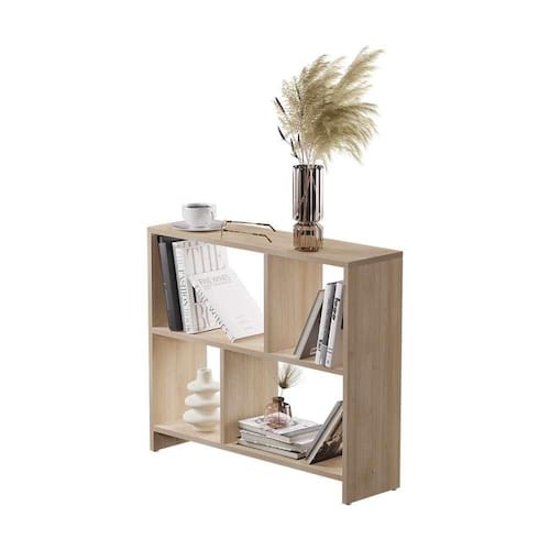 Possui compartimentos projetados para organizar livros, objetos decorativos e outros itens essenciais, mantendo tudo ao alcance das mãos para qualquer ocasião.