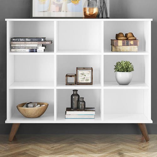 O(a) Estante para Livros 9 Nichos Branco/Retro 1478 - Qmovi é produzido em MDP na escala de brilho Fosco, e possui um grau de dificuldade de montagem: Fácil.