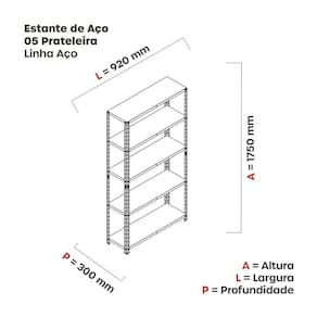 Estante de aço Pandin tem a melhor qualidade do mercado, porque são confeccionadas em chapas #20 e #26 (0,90mm e 0,45mm) priorizando sempre a qualidade, segurança e bem-estar no dia a dia dos nossos clientes. Produto Montado: Sim Acabamento da Prateleira: Pintura Acabamento dos Pés: Pintura Altura dos Pés: 3 Altura Máxima dos Pés: 3.0000 Ambiente Principal: Escritório codigo_ean: 7909903296356 Complexidade da Montagem: Baixa: pode ser montado por uma pessoa sozinha Cor: Azul Dali Cor do Produto: Azul Dali Cor Flex: Azul Dali Cor Interna: Azul Dali Escala de Brilho: Semi-Fosco Escala de Brilho da Prateleira: Semi-Fosco Itens Inclusos: 1 Estante com 5 prateleiras Linha ou Coleção: Aço Manual de Montagem e Instalação: https://product-hub-prd.madeiramadeira.com.br/848576/documents/0984cd98-833a-4f40-8548-805916d06d555190estantevu05prateleiras.pdf Material da Prateleira: Aço Material dos Pés: Polipropileno Material Principal: Aço Necessita Montagem: Sim Origem do Produto: Nacional Peso: 12,45 kg Peso Máximo por Prateleira: 20 kg Possui iluminação: Não Possui Pés: 04 Possui Portas: Não Possui Rodízio: Não Possui Vidro: Não Quantidade de Nichos: 01 Recomendações de Uso, Manutenção e Limpeza: Utilizar um pano levemente umedecido com água, para finalizar utilizar um pano seco. Sapatas Niveladoras: Sim Sistema de Montagem: Parafuso Suporta Até (kg): 20 kg