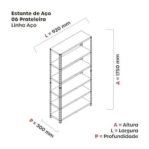 Estante de aço Pandin tem a melhor qualidade do mercado, porque são confeccionadas em chapas #20 e #26 (0,90mm e 0,45mm) priorizando sempre a qualidade, segurança e bem-estar no dia a dia dos nossos clientes. Acabamento da Prateleira: Pintura Acabamento dos Pés: Pintura Altura dos Pés: 3 Ambiente Principal: Escritório Complexidade da Montagem: Baixa: pode ser montado por uma pessoa sozinha Cor: Cinza Cor do Produto: Cinza Cor Flex: Cinza Cor Interna: Cinza Escala de Brilho: Semi-Fosco Escala de Brilho da Prateleira: Semi-Fosco Itens Inclusos: 1 Estante com 6 prateleiras Linha ou Coleção: Aço Manual de Montagem e Instalação: https://cdn2.madeiramadeira.com.br/atributo/pandin/1318735-estante-v-u-06-prateleiras.pdf Material da Prateleira: Aço Material dos Pés: Polipropileno Material Principal: Aço Necessita Montagem: Sim Origem do Produto: Nacional Painel para TV Integrado: Não Peso: 9.83 Peso Máximo por Prateleira: 20 Possui Espelho: Não Possui Possui iluminação: Não Possui Pés: 04 Possui Portas: Não Possui Prateleiras: 06 Possui Vidro: Não Recomendações de Uso, Manutenção e Limpeza: Utilizar um pano levemente umedecido com água, para finalizar utilizar um pano seco. Sapatas Niveladoras: Sim Sistema de Montagem: Parafuso Suporta Até (kg): 20