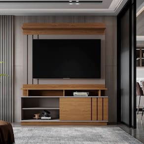 O home goias elegante e robusto, possui tampo e prateleira superior de 2,5cm, painel com detalhe ripado, a porta de correr também possui detalhe ripado, nichos para decorar como desejar e suporta TV de até 55" Produto Montado: Sim Acabamento da Porta: Pintura UV Acabamento da Prateleira: Pintura UV Altura dos Pés: 10 cm Altura Máxima dos Pés: 10.0000 Ambiente Principal: Sala de Estar codigo_ean: 7900288163400 Complexidade da Montagem: Alta: deve ser montado por um montador especializado Cor: Grigio Fosco / Amendoa Cor do Produto: Grigio Fosco / Amendoa Cor Interna: Grigio Escala de Brilho: Semi-Fosco Escala de Brilho da Porta: Semi-Brilho Escala de Brilho da Prateleira: Semi-Brilho Espessura do Painel: 1,5 cm Espessura do Tampo: 25 mm Fixação na Parede: Não Ideal para TVs até (Polegadas): 55 Informações Complementares: Tampo e prateleira superior de 2,5cm, porta de correr com detalhe ripado, painel com detalhe ripado, suporta TV de até 55" Itens Inclusos: 1 Estante Linha ou Coleção: Living Manual de Montagem e Instalação: https://product-hub-prd.madeiramadeira.com.br/508880569/documents/a54f5465-f3dd-4d67-a361-f069bb48c09e2959471277817484336897849.pdf Marca: Mobler Material da Porta: MDP Material da Prateleira: MDP Material dos Pés: ABS Material Principal: MDP Necessita Montagem: Sim Origem do Produto: Nacional Peso: 54,8 kg Peso Máximo por Prateleira: 3 kg Possui Espelho: Não Possui iluminação: Não Possui Nichos: 04 Possui Passa Cabos: Sim Possui Pés: 06 Possui Portas: Sim Possui Prateleiras: Sim Possui Rodízio: Não Possui Vidro: Não Recomendações de Uso, Manutenção e Limpeza: Para conservar a aparência e a durabilidade do produto: - Utilizar pano macio e úmido; - não usar solventes ou abrasivos Sapatas Niveladoras: Não Sistema de Montagem: Parafusos, Cavilhas, Pregos Suporta Até (kg): 45 kg Suporte de TV Universal Incluso: Não Tipo de Puxador da Porta: Não possui