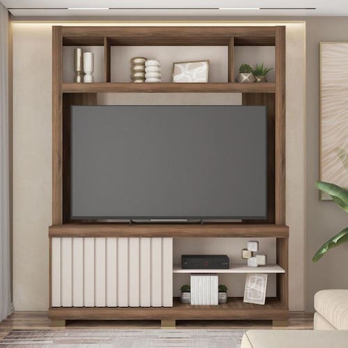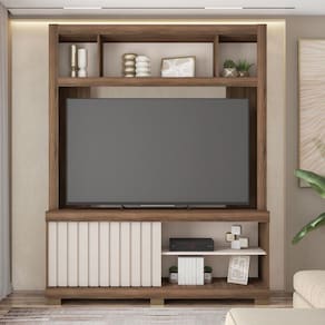 A Estante Cinne é referência em design, beleza e estilo. Ela conta com espaço para TVs de até 55 polegadas . Contém uma porta de correr com Ripado que proporciona otimização do espaço é um charme inigualável o que une a exuberância da marromza ao conforto da modernidade. Com design industrial, conta com espaços para acomodar aparelhos eletrônicos e ainda cinco nichos para acomodar suas decorações preferidas. Acabamento da Porta: Finish Foil Acabamento dos Pés: Melamínico Altura dos Pés: 5 Ambiente Principal: Sala de Estar Complexidade da Montagem: Média: pode ser montado por mais de uma pessoa e/ou necessite de maior conhecimento para montagem Cor: Nogueira San Remo/Off White Cor do Produto: Nogueira San Remo/Off White Cor Flex: Não Cor Interna: Nogueira Escala de Brilho: Fosco Escala de Brilho da Porta: Fosco Ideal para TVs até (Polegadas): 55 Itens Inclusos: 1 Estante, Kit ferragens e Manual de Montagem Manual de Montagem e Instalação: https://product-hub-prd.madeiramadeira.com.br/863641/documents/4c2f427f-33d1-42c3-8c36-ac328b185c1354595eqestantecinneediCAoa.pdf Material da Porta: MDP Material do Puxador da Porta: MDF Material dos Pés: ABS Material Principal: MDP Montagem Flex: Não Necessita Montagem: Sim Origem do Produto: Nacional Peso: 52.59 Possui Espelho: Não Possui iluminação: Não Possui Nichos: 05 Possui Pés: 06 Possui Portas: 01 Possui Prateleiras: Não Possui Rodízio: Não Possui Vidro: Não Recomendações de Uso, Manutenção e Limpeza: Limpar com pano macio levemente umedecido e em seguida pano macio seco. Não utilizar produtos abrasivos (lixas, esponjas) e/ou produtos a base de solventes (thinner, aguarrás). Sapatas Niveladoras: Não Sistema de Montagem: Utiliza-se na montagem do produto sistema de fixação minifix, dobradiças, dispositivos angulares, cavilhas, parafusos, porcas cilindricas, entre outros; Suporta Até (kg): 36 Tipo de Porta: Correr Tipo de Puxador da Porta: Embutido Ean: 7909903378168