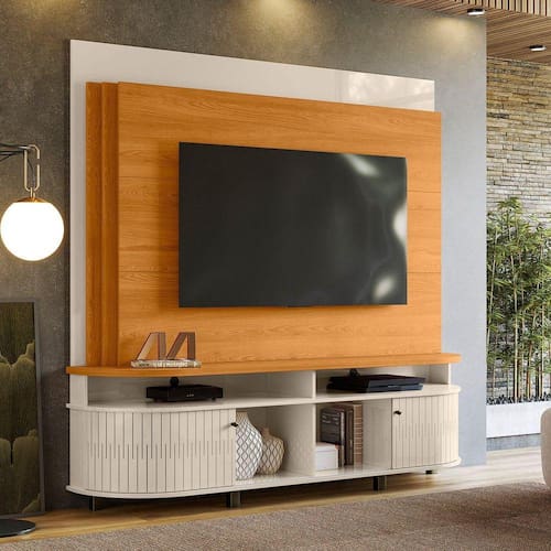 Com 1830mm de largura, traz aconchego à sala de estar. Sua estrutura suporta TVs de até 65". Acabamento da Porta: Pintura UV Acabamento dos Pés: Pintura Altura dos Pés: 7,5 cm Ambiente Principal: Sala de Estar Complexidade da Montagem: Baixa: pode ser montado por uma pessoa sozinha Cor: Cinamomo/Off White Cor do Produto: Cinamomo/Off White Escala de Brilho: Fosco Escala de Brilho da Porta: Brilhante Ideal para TVs até (Polegadas): 65 Informações Complementares: Portas deslizantes flexíveis em MDF ; Paineis em MDP 15 e 25mm; Indicado para TV até 65 polegadas; Fixação com minifix. Itens Inclusos: Peças; Acessórios; Manual de montagem Linha ou Coleção: Linha Arco Manual de Especificação Técnica: https://product-hub-prd.madeiramadeira.com.br/892164/documents/0128b54e-2e12-4e28-8c15-307e3b1a67aaterdaytonacinamomooffwhite.pdf Manual de Montagem e Instalação: https://product-hub-prd.madeiramadeira.com.br/892164/documents/89153cc4-00ca-4138-acb1-d69be87dee3e793283651esquemademontagem.pdf Material da Porta: MDF Material do Puxador da Porta: Poliestireno Material dos Pés: MDP Material Principal: MDF/MDP Montagem Flex: Não Necessita Montagem: Sim Origem do Produto: Nacional Peso: 67,4 kg Possui Espelho: Não Possui iluminação: Não Possui Nichos: 04 Possui Pés: 06 Possui Portas: 02 Possui Prateleiras: Não Possui Rodízio: Não Recomendações de Uso, Manutenção e Limpeza: Para a limpeza utilizar um pano limpo e seco. Não limpar com produtos abrasivos ou escovas;Não deixar exposta à luz do sol diretamente pois isso irá diminuir a vida útil do produto;Este produto Não é recomendado Para ambientes externos onde possa receber chuva. Sapatas Niveladoras: Não Sistema de Montagem: Parafusos, Cavilhas e Minifix Suporta Até (kg): 65 kg Suporte de TV Universal Incluso: Não Tipo de Dobradiça/Corrediça da Porta: Alumínio Tipo de Puxador da Porta: Externo