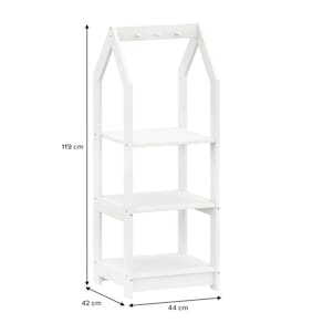 O Mini Closet Casinha Organizador Infantil Madeira Sally é a solução ideal para quem busca praticidade e estética no quarto infantil. Feito em madeira maciça, com estrutura firme e formato lúdico, ele oferece três prateleiras para roupas, brinquedos ou livros e um cabideiro com ganchos para pendurar as peças preferidas da criança.