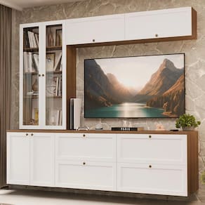 O conjunto é composto por gavetas e armários amplos, um armário com portas de vidro, que pode ser utilizado como cristaleira ou livreiro. Essa combinação permite acomodar uma TV, organizar livros, louças e itens decorativos com facilidade. O acabamento da estrutura é no tom amadeirado Rustic e das frentes em Branco, possui alta resistência, trazendo um visual sofisticado e textura suave ao toque.