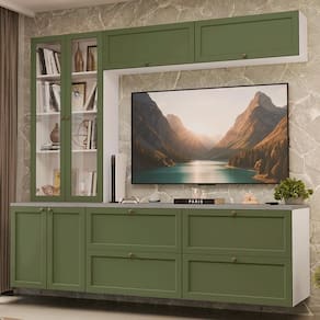O conjunto é composto por gavetas e armários amplos, um armário com portas de vidro, que pode ser como cristaleira ou livreiro. Essa combinação permite acomodar uma , organizar livros, louças e itens decorativos com facilidade. O acabamento da estrutura é em Branco e das frentes em Verde, possui alta resistência, trazendo um visual sofisticado e textura suave ao toque.
