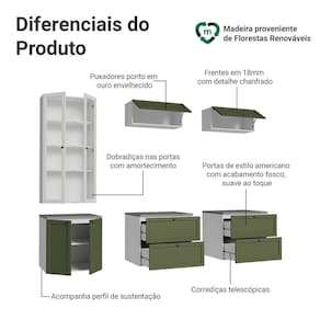 O conjunto é composto por gavetas e armários amplos, um armário com portas de vidro, que pode ser como cristaleira ou livreiro. Essa combinação permite acomodar uma , organizar livros, louças e itens decorativos com facilidade. O acabamento da estrutura é Branco, das frentes em Verde e da cristaleira em Branco também, possui alta resistência, trazendo um visual sofisticado e textura suave ao toque.