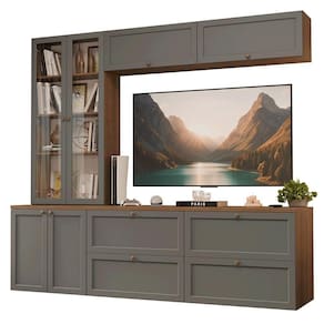 O conjunto é composto por gavetas e armários amplos e um armário com portas de vidro, que pode ser como cristaleira ou livreiro. Essa combinação permite acomodar uma , organizar livros, louças e itens decorativos com facilidade. O acabamento de alta resistência da estrutura é no tom amadeirado Rustic e das frentes em Cinza, trazendo um visual sofisticado e textura suave ao toque.