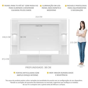 Dimensões do produto montado: Altura: 171cm | Largura: 213cm | Profundidade: 38cm Painel - Altura: 98cm | Largura: 150cm *Devido as variações de tamanho dos televisores no mercado, sugerimos que verifique as medidas da sua TV e compare com o painel antes de efetuar a compra. *Não recomendamos utilizar suporte de TV articulado. *Você pode consultar as medidas internas na imagem técnica do produto.