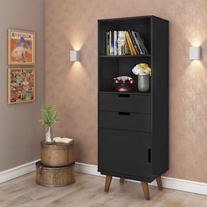 Esta é uma estante vintage com design diferenciado e prático onde poderá ser colocada em qualquer ambiente valorizando e dando personalidade. Possui duas prateleiras para colocar livros e objetos, duas gavetas em mdf com puxadores usinados e uma porta também em mdf com puxador usinado. O diferencial também são os pés vintage chanfrados em madeira envernizados. Os produtos da Olivar Móveis não servem apenas para preencher os espaços da sua casa, mas sim para transformar em um lugar aconchegante, atraente e com um design moderno, sem abrir mão da qualidade.