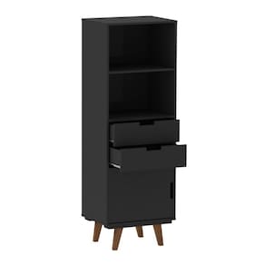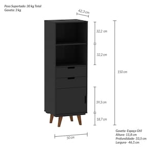 - Material: Mdp e Mdf - Quantidade de Prateleiras: 2 - Quantidade de Portas: 1 - Quantidade de Pés: 4 - Quantidade de Gaveta: 2 - Peso do Produto Montado: 346 - Peso Máximo Suportado: 30 - Medida do Produto Montado (LXCXA): 42cmx55cmx161,8cm - Acabamento: Pintura UV - Escala de Brilho: Acetinado - Material da Estrutura: MDP E MDF DE 15 E 25 mm - Produto Necessita de Montagem?: Sim - Tipo de Gaveta: Gavetas com corrediças deslizantes - Tipo de Pés: Pés Vintage 170mm em madeira envernizado - Tipo de Porta: Rotação - Tipo de Prateleira: Fixa - Recomendações de manutenção: Pano úmido. Não aplicar lustra móveis. - Volumes: 1 Volume - Garantia: 3 meses
