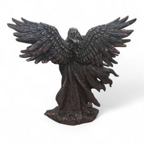 Ricamente detalhada, esta escultura transmite paz e reverência, com asas abertas em movimento e expressão serena. Ideal para quem busca proteção espiritual, elevação energética ou deseja compor um altar com presença angelical poderosa.