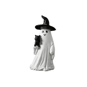 Material: Resina Tamanho: 8 cm × 7 cm × 17 cm Peso: 220 g ['Charming Ghost and Cat Design — Esta escultura de resina apresenta um fantasma branco sorridente usando um chapéu de bruxa preto e segurando um gatinho, adicionando uma atmosfera extravagante de Halloween à sua casa ou jardim. ', 'Material de resina durável — Feita de resina de qualidade premium, esta estátua de jardim é à prova d'água, resistente às intempéries e perfeita para decorações de Halloween internas e externas. ', 'Perfect Garden Accent — Coloque essa figura fantasma em seu pátio, gramado, quintal ou entrada para criar uma atmosfera sazonal divertida e assustadora que encanta crianças e adultos. ', 'Detalhes artesanais — As texturas cuidadosamente pintadas e os detalhes finos do manto e do chapéu do fantasma dão vida à escultura, mostrando um artesanato excepcional. ', 'Tamanho decorativo compacto — Medindo 8 × 7 × 17 cm e pesando 220 g, esta figura cabe facilmente em mesas, prateleiras ou jardins para uma exibição fofa e atraente.']