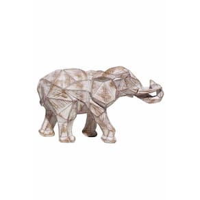 Linda estátua de elefante, com design geométrico em alto-relevo. Todo feito em Resina. Com cor semelhante a madeira com detalhes brancos, não assimétrico.