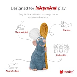 Em um dos melhores restaurantes de Paris, Remy, um jovem rato determinado, sonha em se tornar um renomado chef francês. Dividido entre os desejos de sua família e seu verdadeiro chamado, Remy e seu amigo, Linguini colocaram em movimento uma hilária cadeia de eventos que vira a Cidade das Luzes de cabeça para baixo. - Em um dos melhores restaurantes de Paris, Remy, um jovem rato determinado, sonha em se tornar um renomado chef francês. Dividido entre os desejos de sua família e seu verdadeiro chamado, Remy e seu amigo, Linguini colocaram em movimento uma hilária cadeia de eventos que vira a Cidade das Luzes de cabeça para baixo. - Ensina as crianças a seguir seus sonhos, cozinhar e trabalhar em equipe. - Inclui o personagem de brinquedo Ratatouille da Disney/Pixar com 1 história e tempo total de execução de aproximadamente 47 minutos. Faixa etária recomendada: 6+, Idioma: inglês. - Tracklist: Ratatouille Storyteller - Requer Toniebox Audio Player para reproduzir áudio; vendido separadamente.