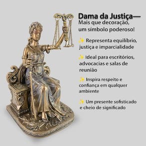 Imponente e cheia de significado, esta estatueta da Dama da Justiça é perfeita para compor ambientes com elegância e personalidade. Representando a justiça com seus tradicionais símbolos - a balança, a espada e os olhos vendados - ela transmite valores como equilíbrio, verdade e imparcialidade. Ideal para escritórios, bibliotecas, salas de estudos ou ambientes jurídicos, é também uma excelente opção de presente para advogados, estudantes de direito ou amantes da simbologia clássica. Um item que une arte, força e sofisticação em um só objeto. Símbolo poderoso: Representa justiça, equilíbrio e imparcialidade - ideal para ambientes ligados ao Direito ou para quem valoriza esses princípios. Decoração elegante: Acrescenta um toque clássico e sofisticado à decoração de escritórios, salas de estudos, bibliotecas ou home office. Presente com significado: Excelente opção para presentear advogados, juízes, estudantes de Direito ou profissionais da área jurídica. Versatilidade: Combina bem com estilos decorativos variados - do clássico ao moderno. Inspiração diária: Serve como lembrete visual de ética, responsabilidade e justiça no dia a dia.