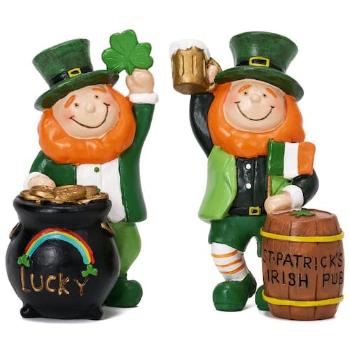 Valery Madelyn Estatueta de jardim de duende do dia de São Patrício, decoração de casa, bandeja irlandesa de 2 quilates com trevo, gnomo de resina verde média, decoração de presente de dia de São Patrício para mesa de centro de mesa - ?Design autêntico?A Valery Madelyn é uma marca de varejo que adere às decorações sazonais autênticos. Cada estatueta possui elementos exclusivos, como um pote de ouro com um arco-íris e um barril marcado como "Patrick's Irish Pub", adicionando personalidade e narrativa ao design. - ?Artesanato requintado?Estas estátuas do Dia de São Patrício de 2 peças são feitas de materiais de resina resistentes e são bem feitas por esculpidas e pintadas à mão. que é resistente e duradoura, as estatuetas do Dia de São Patrício moldadas por ela são fofas e não deformam ou desbotam facilmente. - Cor uniforme: esta estatueta de gnomo tem coloração uniforme e excelente solidez da cor. A superfície tem um certo efeito de textura, e tanto a aparência quanto o toque podem sentir uma certa sensação de valor - ?Aplicação?Estas decorações do Dia de São Patrício são adequadas para peças centrais de mesa, interiores, lareiras, escrivaninha, bandeja em camadas, prateleira, sala de estar, quarto, criando um efeito mais encantador e mágico - ?Presente perfeito?Todos são muito fofos e significativos, não apenas adequados para manter em casa, mas também perfeitos como presentes para familiares e amigos. - ?Tamanho da estatueta? O conjunto de enfeites do Dia de São Patrício mede aproximadamente 12 cm como na imagem