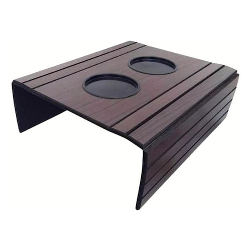 Dimensões: 38cm x 30cm Corte à laser - extrema qualidade e acabamento; Fabricado com 100% madeira de reflorestamento; Design moderdo e elegante; Por ser flexível se adapta à qualquer braço de sofá; 2 porta copos;