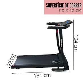 Peso e medidas (aproximados) Medidas do produto: 104 x 56 x 131 cm (altura x largura x profundidade) Área de uso (caminhada/corrida): 40 x 110 cm (largura x comprimento) Comprimento do cabo de energia: 1,5 m Medidas da embalagem: 22 x 67 x 149 cm (altura x largura x comprimento) Peso: 36 kg