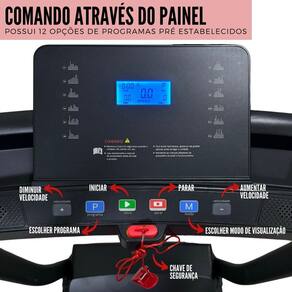 Uso para caminhada e corrida Estrutura compacta Armazenamento facilitado Programas de treino Controle de velocidade Acompanha óleo lubrificante Painel touch Painel com botões de atalho Controles também no apoio lateral