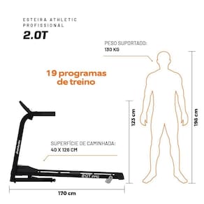 Especificações TécnicasProduto: Esteira Ergométrica Athletic 2.0TMarca: AthleticModelo: 2.0TLinha: SemiprofissionalIndicado para Uso: Residencial, Condomínio, Construtoras, Studio e HotéisTipo de Esteira: Elétrica, DobrávelVelocidade Mínima: 1 km/hVelocidade Máxima: 16 km/hPotência do Motor: HPTipo do Motor: Corrente Alternada AC (Motor WEG)Superfície de Caminhada/Corrida: 40 x 128 cmSistema de Inclinação: Com 2 níveisTipo de Inclinação: ManualProgramas de Treino: 26 programasAmortecedores: 8 Amortecedores InternosDobrável: Sim (com sistema Guarda-Fácil vertical)Peso Máximo Suportado pelo Usuário: 130 kgFunções do Monitor: 16 Funções (Velocidade, Tempo, Distância, Calorias, Batimentos Cardíacos, ODO, Scan, Sleep, Gráfico Programa, Acesso Velocidade rápida, THR, IMC, Recuperação pós treino, Programação Contagem Regressiva Cal/Dis/Time)Sensor de Batimentos Cardíacos: Sim (Sistema Hand Grip)Display: LCD blue backlightAlimentação do Monitor: Via cabo de energiaTecla de Atalho: No monitor (6 teclas de atalho de velocidade)Porta Objetos: SimSistema de : Chave de para parada de emergência, lona antiderrapante e carenagem de proteção no motorLona: Fácil de ajustarPlataforma: Em MaDeFibra BP laminado melamínico de 18mm com acabamento com resina especialLubrificação: Manual (aplicação fácil, usar silicone específico)Tipo de Exercício: Aeróbico, Condicionamento Físico, Resistência, HIIT, Fortalecimento Muscular, Perda de PesoPartes do Corpo Trabalhadas: Pernas, Costas, Abdominais e GlúteosExercícios Possíveis: Caminhadas, trotes e corridasTamanho: ÚnicoCor: EscuroEstrutura: Aço carbonoPintura: Eletrostática a pó, alta resistência a corrosãoDimensões Aproximadas Montada (A x L x C): 123 x 73 x 170 cmPeso Líquido: 42,4 kgComposição: Aço, MaDeFibra e PlásticoCuidados com o Produto: Manter a lubrificação em dia, a limpeza deve ser feita com pano úmidoGarantia: 1 ano (Consultar o manual)Assistência Técnica: A Athletic possui uma rede de assistência técnicaMontagem: Fácil (sistema de montagem easy fast)Condição do Produto: NovoItens da Caixa: 1 Esteira ergométrica, 1 chave de , 1 manual do usuário, 1 Kit de montagemDimensões Embaladas (A x L x C): 33 x 83 x 177 cmPeso Embalada: 46,8 kgFabricante: AthleticRodas para : Sim (duas rodas dianteiras)Voltagem: 110 ou 220 (escolher no ato da compra)